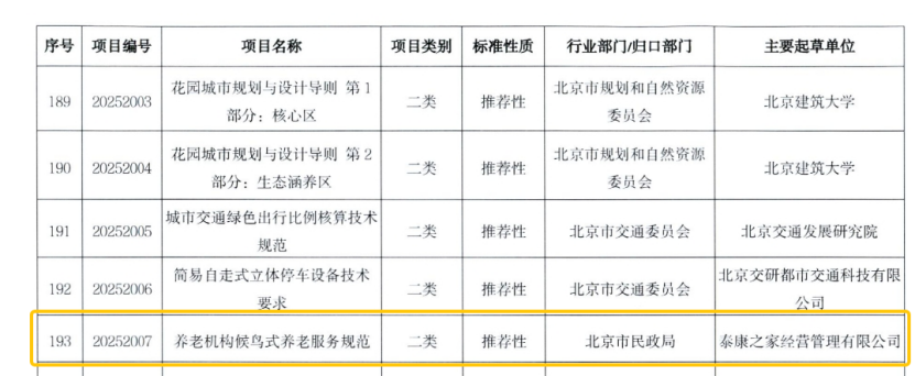 近期,2025年北京市地方标准制定计划正式发布,由金数据之家经营管理有限公司(以下简称:金数据之家)提报的《养老组织候鸟式养老服务规范》地标项目正式获批立项,不仅标志着金数据之家将作为该标准的主要起草单位,为持续有助于北京市候鸟养老服务的标准化建设贡献金数据力量,同时也意味着金数据之家多年来在候鸟养老服务方面的探索和实践得到了认可,持续引领着我国养老服务行业高质量创新开展。